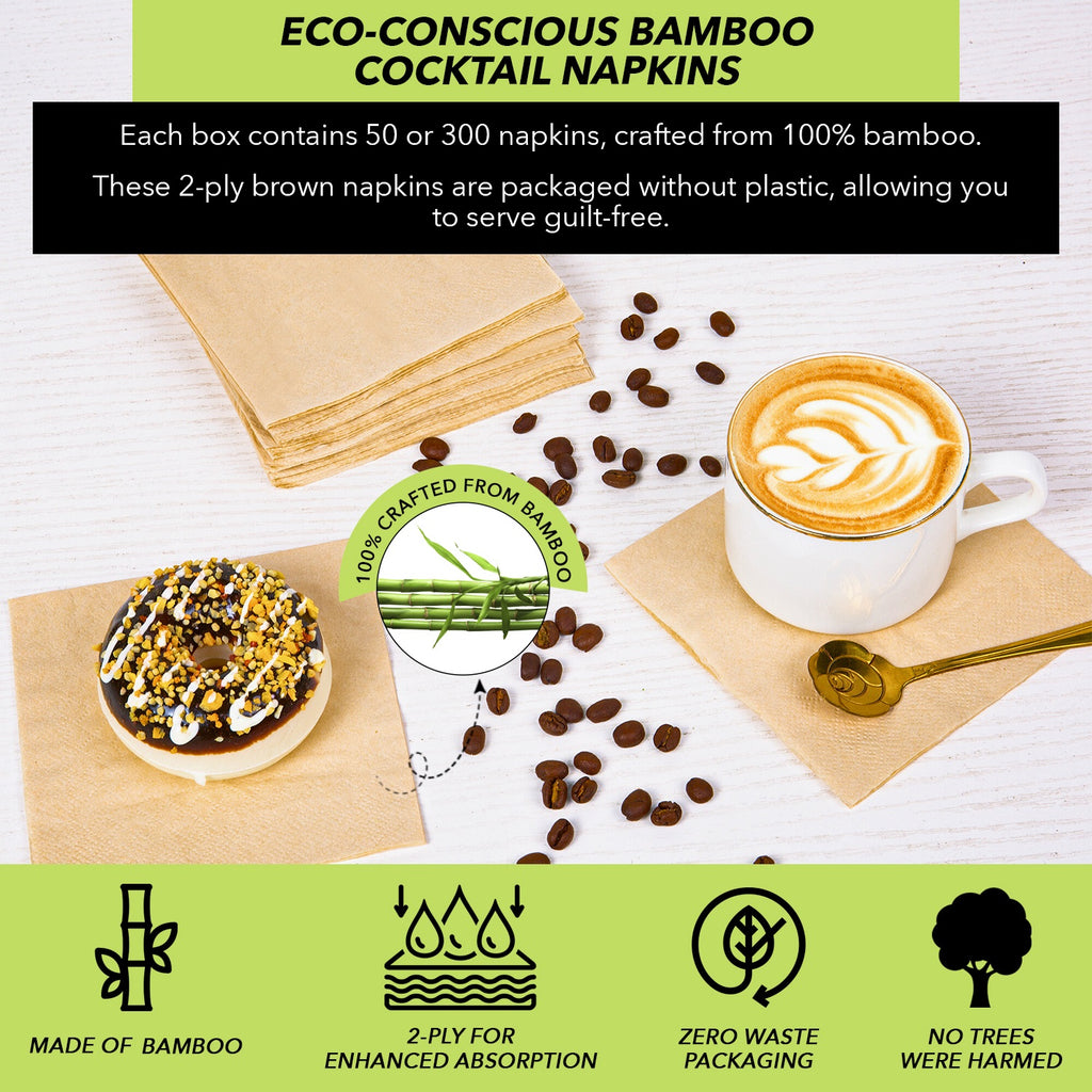 - Bamboo Cocktail Napkins - Crafted from bamboo and packaged without plastic, these 2-ply brown napkins are perfect for accompanying drinks and appetizers at any gathering.
