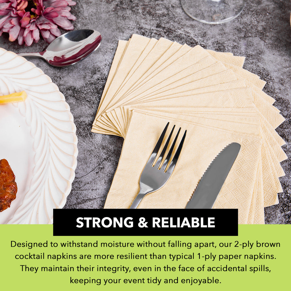 - STRONG & RELIABLE - Designed to withstand moisture without falling apart, our 2-ply brown cocktail napkins are more resilient than typical 1-ply paper napkins. They maintain their integrity, even in the face of accidental spills, keeping your event tidy and enjoyable.